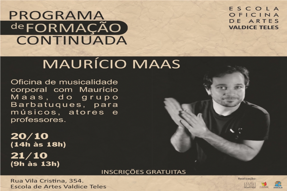 Uma das maiores referências em percussão corporal do país, o grupo ‘Barbatuques’ se tornou conhecido por desenvolver uma técnica muito particular de percussão corporal. Essa técnica, onde o instrumento é o próprio corpo, será ensinada num workshop realizado pela Fundação Cultural Cidade de Aracaju (Funcaju), através da Escola de Artes Valdice Teles. O programa de formação continuada acontece na escola de arte (rua Vila Cristina, 354, bairro São José), na sexta-feira, 20, a partir das 14h, e prossegue no sábado, 21, às 9h.