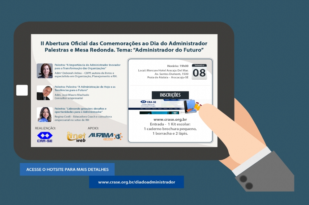 No dia 9 de setembro, Dia do Administrador, celebraremos 49 anos da profissão, com eventos, palestras e debates realizados pelas Instituições de Ensino Superior (IES) e pelos Conselhos Regionais de Administração (CRAs). Em Sergipe, o Conselho Regional de Administração (CRA-SE) realizará a II Abertura Oficial das Comemorações ao Dia do Administrador, no dia 8 de setembro, às 19h, no Mercure Hotel, em Aracaju.