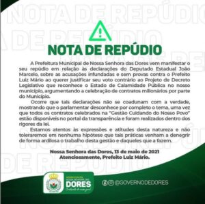 Na contramão: deputado da região de Dores faz denúncia infundada Tem político que esquece que as ações ficam na memória do povo. Não se justifica um deputado estadual que obteve uma excelente votação no município votar contra o Estado de calamidade pública porque é oposição ao prefeito. Esquece que a gestão está acima dos interesses eleitorais e o principal objetivo é atender os anseios da população. O deputado estadual João Marcelo, que votou contra o Estado de calamidade pública no município de Dores, já deve ter sentido a péssima repercussão nas redes sociais da região. O atual prefeito, Mário, desde que assumiu a Prefeitura vem dando publicidade e transparência a todos os atos. Parece que em tão pouco tempo já começou a incomodar. Ao lado a nota de repúdio publicada pela prefeitura.