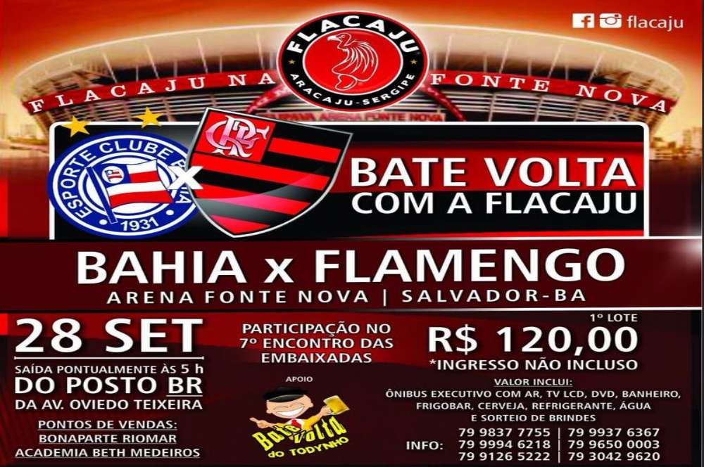 A FLACAJU está organizando um bate volta, para o próximo dia 28: Bahia X Flamengo na Fonte Nova, o 1º lote está sendo
