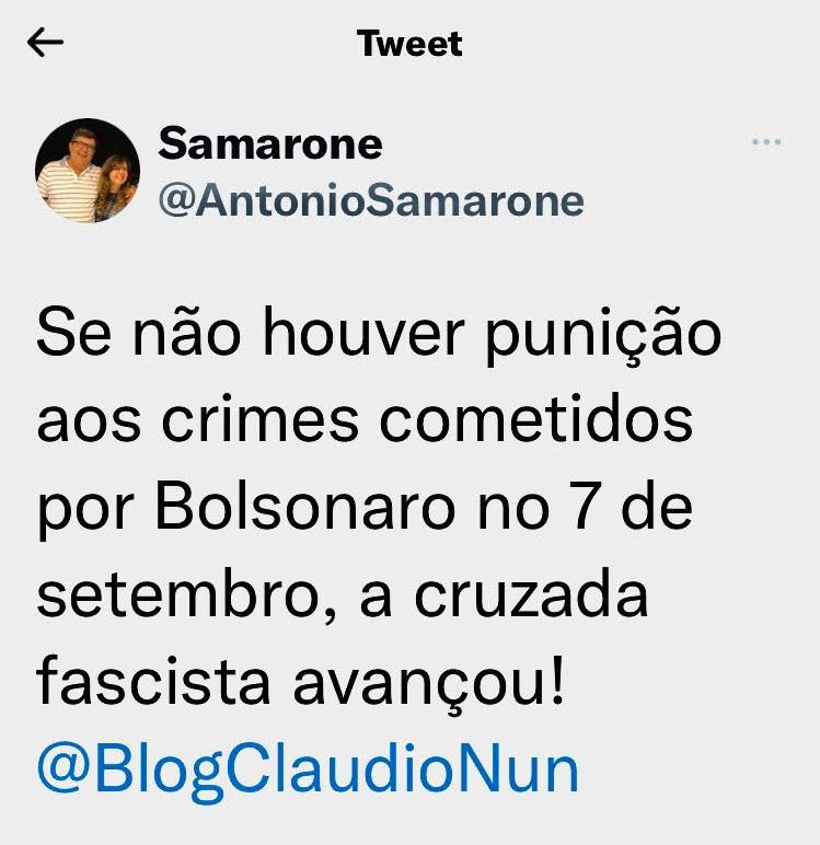 www.twitter.com/AntonioSamarone Se não houver punição aos crimes cometidos por Bolsonaro no 7 de setembro, a cruzada fascista avançou!