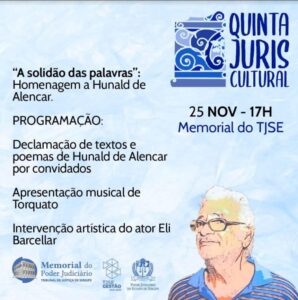 Hoje, 25, a partir das 17h: homenagem a Hunald Alencar na Quinta Juriscultural do TJSE O Tribunal de Justiça do Estado de Sergipe realiza nesta quinta-feira, 25, às 17 horas, no memorial do Poder Judiciário, localizado na praça “Olímpio Campos”, 417, centro de Aracaju, a 5ª edição do Projeto “Quinta Juriscultural”. Com o tema “A Solidão das Palavras”, o sarau Litero Musical homenageará o professor de língua portuguesa, literatura brasileira, poeta e dramaturgo Hunaldo Fontes de Alencar.