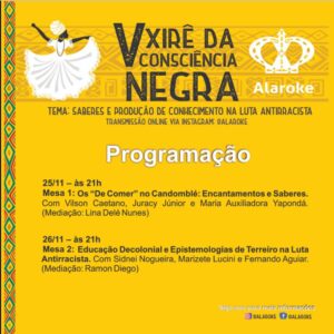 O Ilê Axé Alaroke promove, nos dias 25 e 26 de novembro, a 5ª edição do Xirê da Consciência Negra, com o tema ‘Saberes e Produção de Conhecimento na Luta Antirracista’. O evento será realizado online,
