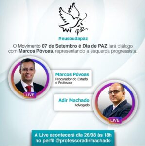 É hoje, 26, às 18h: 07 de Setembro um Dia de Paz, campanha encabeçada pelo advogado Adir Machado Bandeira 07 de Setembro um Dia de Paz, campanha encabeçada pelo advogado Adir Machado Bandeira. A proposta é bem simples. Não abandone suas convicções. Apenas venha defender conosco o direito ao pluralismo.O Movimento avança e vai dialogar com a esquerda. A PAZ se constrói com diálogo. O convidado de hoje, 26, às 18h, será o Procurador do Estado e professor de direito, Marcos Póvoas. Não percam, pelo instagram: https://www.instagram.com/professoradirmachado/ Na última segunda-feira, 23, a live foi com um representante da chamada direita, o publicitário, Lúcio Flávio, Coordenador Nacional do Movimento Brasil 200.