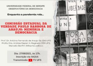 Comissão Estadual da Verdade Paulo Barbosa de Araújo: Memória e Democracia A Universidade Federal de Sergipe, através do Observatório da Democracia, com o objetivo discutir o relatório da Comissão Estadual da Verdade “Paulo Barbosa de Araújo”, centrando-se nas políticas de memória e dos usos do passado no contexto da história recente de Sergipe, realizará nesta sexta-feira, 27, a partir das 17h, um debate com a participação do Prof. Dr. Antônio Fernando de Araújo Sá (DHI/UFS), da Profa. Dra. Andréa Depieri (DDI/UFS) e do militante político e ex-vereador Marcélio Bonfim. Trasmissão pela TV UFS: