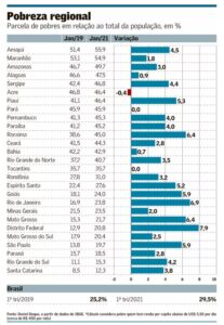 Aumento em 24 das 27 unidades da federação Estudo do economista Daniel Duque, pesquisador do Instituto Brasileiro de Economia da Fundação Getúlio Vargas (FGV Ibre), mostra que o percentual da população pobre aumentou em 24 das 27 unidades da federação brasileira entre o primeiro trimestre de 2019 e janeiro de 2021. Ainda que com alguma expectativa de melhora para os dados mais recentes, por causa da retomada do pagamento do auxílio emergencial a partir de abril e de início de reação do mercado de trabalho informal, a expectativa entre economistas é que os níveis de pobreza se mantenham acima do verificado antes da covid-19. Toda matéria aqui.