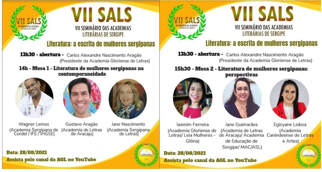 A Academia Gloriense de Letras (AGL), neste sábado, 28/08/21, às 13h30, via sala virtual no Google Meet, com transmissão pelo canal da Academia no YouTube, realizará o VII Seminário das Academias Literárias de Sergipe (SALS), O tema desta edição será “Literatura: a escrita de mulheres sergipanas”.