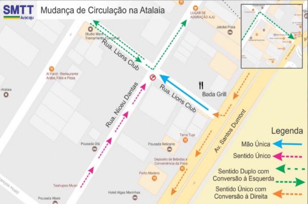 No bairro da Atalaia, o trecho da Rua Lyons Club, com a Avenida Santos Dumont, passa a ter sentido único de circulação, em direção a Rua Niceu Dantas. Com a mudança, o condutor que estiver na Rua Niceu Dantas e deseja acessar a Avenida Santos Dumont, terá que convergir na Rua Napoleão Dórea. Já o condutor que estiver na Avenida Lyons Club, no trecho de mão dupla, e deseja ir para a Avenida Santos Dumont, deverá fazer o mesmo itinerário de quem vem pela Niceu Dantas.
