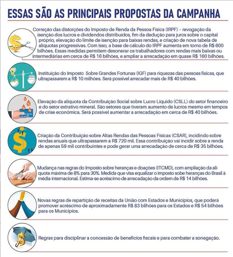 Uma campanha para implementar um conjunto de medidas para enfrentar a crise econômica, agravada pela pandemia, com o aumento dos tributos sobre as altas rendas, grandes patrimônios e a redução para as baixas rendas e pequenas empresas: “Todos sabemos que o Brasil é um país injusto e desigual, mas o que a maioria não sabe é que os SUPER-RICOS pagam, proporcionalmente, muito menos impostos do que os mais pobres. Neste momento de crise em que vivemos, e que se agravou por causa da Covid-19, é necessário e urgente ampliar os gastos públicos para garantir a sobrevivência das pessoas e a retomada da economia.”