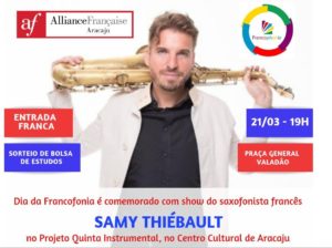 francês Samy Thiébault a Aracaju, pela primeira vez, para uma apresentação repleta de jazz francês e música instrumental de qualidade para os aracajuanos. O show será realizado nesta quinta-feira, 21 de março, às 19h, na praça General Valadão, marco zero da capital, em frente ao Centro Cultural. Na mesma noite, haverá o sorteio de uma de bolsa de estudos da Aliança Francesa bem como a apresentação do grupo sergipano Taco de Golfe.