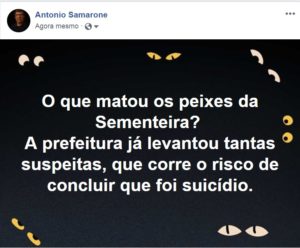 www.twitter.com/AntonioSamarone O que matou os peixes da Sementeira? A prefeitura já levantou tantas suspeitas, que corre o risco de concluir que foi suicídio.