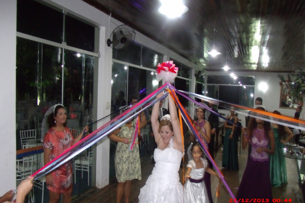 5 – Em vez de jogar o buquê tradicionalmente. Enrole várias fitas no buquê e dê as estremidades das fitas às moças solteiras. A noiva não pode olhar ou venda os olhos e segura o buquê bem alto e vai cortando as fitas. A moça que ficar com a última fita é a ganhadora do buquê da noiva e mais um brinde.