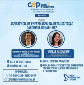 Rede Primavera abre inscrições para Curso de Enfermagem na Ressuscitação Cardiopulmonar A Rede Primavera, através do CEP – Centro de Ensino e Pesquisa, realiza no dia 18 de setembro, o “Curso de Assistência de Enfermagem na Ressuscitação Cardiopulmonar, ministrado pelos enfermeiros Cleidinaldo Marques e Jamille Nascimento. O curso é voltado para estudantes de enfermagem, técnico/auxiliar em enfermagem e enfermeiros, com o objetivo de proporcionar, à equipe de enfermagem, uma efetiva assistência durante a reanimação do paciente, busca de conhecimento, troca de experiências, aperfeiçoamento técnico e o fortalecimento do trabalho coletivo. A parada cardiorrespiratória (PCR) é considerada uma das mais importantes emergências no setor médico, já que a sobrevida está ligada ao tempo e à qualidade do atendimento realizado. Para maiores informações entrem em contato: cep@redeprimavera.com.br ou (79) 9 9963 0537. Participe!