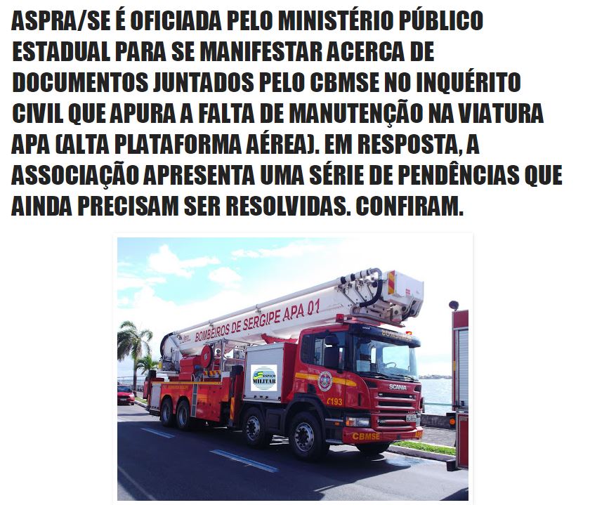 Ainda no expediente encaminhado ao MPE, a ASPRA/SE relata que espera que os problemas apresentados possam ser efetivamente equacionados para que a viatura APA possa funcionar corretamente e com segurança para os bombeiros miliares, não só para os que trabalham efetivamente com a mesma, bem como, para os que são colocados no cesto para içamento no combate a incêndio ou salvamento, zelando-se assim para que não ocorram acidentes durante a operação da mesma em ocorrências.