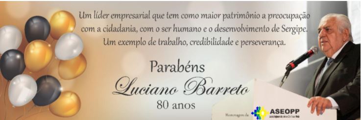 Homenagem do amigo irmão O empresário Aroldo Franca, da Valor Imobiliária, amigo de muitos anos de Luciano Barreto fez questão de enviar um mensagem para homenagear os 80 anos “Meu amigo irmão Dr. Luciano você se confunde com o desenvolvimento do nosso Estado. Sergipe e Aracaju têm muita gratidão com você. Dr. Luciano você é um ícone do nosso desenvolvimento, seja como cidadão, como esposo, como pai, como amigo, como empreendedor e principalmente com o coração como com o trabalho social do Instituto Luciano Barreto Júnior que tenho uma admiração enorme. Você sabe da minha admiração pelo que faz pelas pessoas principalmente as carentes através do Instituto propiciando condições para que centenas de jovens tenham qualificação. Parabéns Dr. Luciano pelos 80 anos e que venham mais 80 porque Sergipe, Aracaju e o Brasil precisam de cidadãos como você, com o coração grande e sempre pensando no melhor para todos, no coletivo. Feliz aniversário meu amigo irmão.” Aroldo Franca.