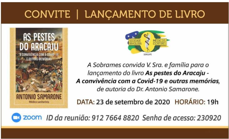 Lançamento online pela plataforma Zoom: Dia 23 de Setembro, às 19h “As Pestes de Aracaju – A convivência com a Covid-19 e outras memórias” do médico sanitarista Antônio Samarone, pela Sociedade Brasileira dos Médicos – Sobrames/SE. Pela plataforma zoom. Id da reunião: 912 7664 8820. Senha de acesso: 230920.