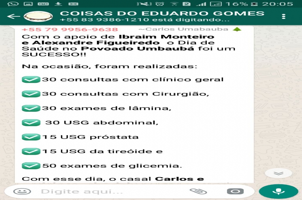 A captação de votos começou! Pode isso amigo? Pelo zap: “E no grupo de zap, “Coisas do Eduardo Gomes” a liderança Carlos Umbaubá, do povoado Umbaubá, publicou vários atendimentos do “Dia da Saúde”, com o apoio pasmem, dos pré-candidatos Ibraim Monteiro e Alexandre Figueiredo. A captação de votos começou! Pode isso amigo?”