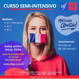Os cursos de Francês da Aliança Francesa estão com Matrículas Abertas. As aulas do curso Perfectionnement du français, indicado a quem já fala e quer praticar o francês oral e escrito, começam no dia 5 de abril. Há também os módulos A1.1, A2.1 e B1.1 do Curso Semi-Intensivo, que começam no dia 19 de abril e são destinados a alunos iniciantes bem como àqueles que desejam continuar os estudos, através de uma plataforma interativa, de forma online e ao vivo. Matricule-se agora mesmo! Você também pode se inscrever gratuitamente numa Aula Experimental de Francês. Para mais informações, acesse www.afaju.com.br/matriculas ou entre em contato pelos números 79 98877-7904 | 98877-7905 | 98877-7906 | 3211-9868.