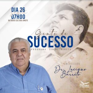 Nesta sexta-feira, 26, às 7h, no programa Linha Direta da Rádio Cultura homenagem a Luciano Barreto A Rádio Cultura de Sergipe, através do programa Linha Direta, homenageia grandes personalidades que marcam nosso estado, com exemplos de sucessos imensuráveis que se tornaram referência para os sergipanos. O quadro Gente de Sucesso deste mês de março homenageia o empresário Luciano Barreto, que tem uma trajetória que honra todos os sergipanos. Uma vida com pilares voltados para a família, o trabalho e o desenvolvimento de Sergipe.Acompanhe hoje, 26, às 07h no Programa Linha Direta, com Jairo Alves e Cláudio Leite, na Rádio Cultura AM670!