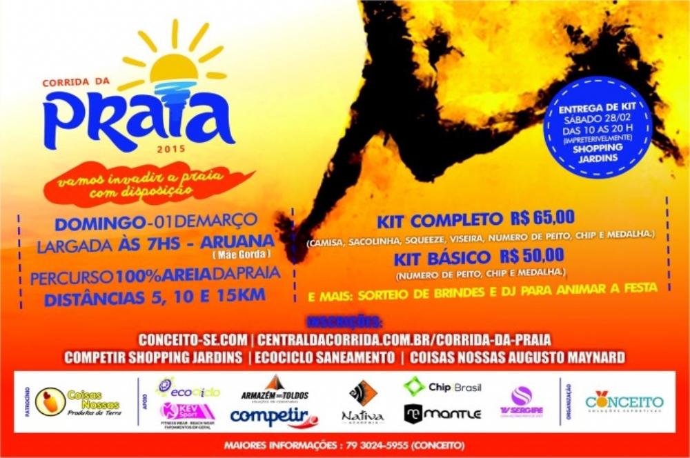 Faltam 19 dias para a Corrida da Praia. As inscrições estão sendo feitas on line, através da Central da Corrida, ou nas lojas Coisas Nossas, Ecocciclo Bike e Competir. A prova acontece no dia 1º de março, nas areias da Aruana, com percurso entre 5km, 10km e 15km. O kit completo (camisa, sacola, squeeze, viseira, número, chip e medalha) custa R$ 65,00; o kit básico (número, chip e medalha), custa R$ 50,00. Mais informações pelo telefone (79) 3024-5955 ou pelo whatsapp (79) 8126-4948. O evento está sendo organizado pela Conceito Soluções Esportivas.