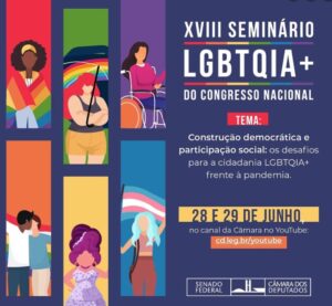com o Senado Federal, realiza nos dias 28 e 29 de junho o XVIII Seminário LGBTQIA+ do Congresso Nacional, com o tema “Construção Democrática e Participação Social: os desafios para a cidadania LGBTQIA+ frente à pandemia”. O objetivo do evento é discutir a participação dessa parcela da população nos mais variados espaços, os direitos já conquistados e estimular o envolvimento em políticas de ação e de controle social nos Três Poderes.