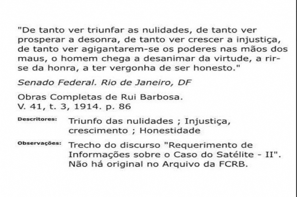 Vivemos o tempo de ter vergonha de ser honesto. Rui Barbosa já registrou sabiamente em 1914 no Senado Federal (ver quadro