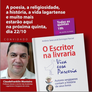 Live hoje, 22, às 19h, Dentro do projeto todas as quintas-feiras “O Escritor na Livraria” onde autores sergipanos contam histórias de seus livros, hoje, 22, será a vez do escritor Claudefranklin Monteiro, professor-doutor e escritor das Academias Lagartense e Sergipana de Letras. O projeto tem a apresentação dos escritores Antônio Saracura e Domingos Pascoal. Acompanhe e participe aqui: https://www.instagram.com/o_escritor_na_livraria/