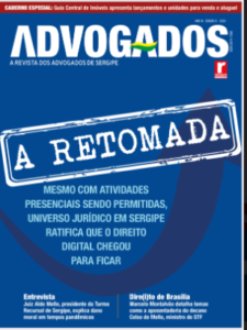 Revista Advogados Já está circulando a edição mais nova da revista Advogados que em pouco tempo já se tornou referência no meio jurídico de Sergipe. Nesta edição a revista tem uma matéria especial sobre a retomada da economia por conta da pandemia da Covid-19, analisando que mesmo com as atividades presenciais permitidas, o universo jurídico em Sergipe ratifica que o direito digital chegou para ficar. A revista traz também uma entrevista com o juiz de direito, Aldo Mello, abordando o tema dano moral na pandemia, mero incômodo e muito mais.