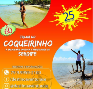 Coqueirinho – A trilha mais gostosa e refrescante de Sergipe! Restam pouquíssimas vagas! Saída dia 25 de outubro de 2020 às 7h (domingo) /Retorno dia 25 de outubro de 2020 às 18h30 (domingo) / Saída do estacionamento do Teatro Tobias Barreto (D.I.A.). Nível da trilha: Leve/Média (Escala de 1 a 10, 7,0) 10km. Mais informações: 79 99959 – 2100.