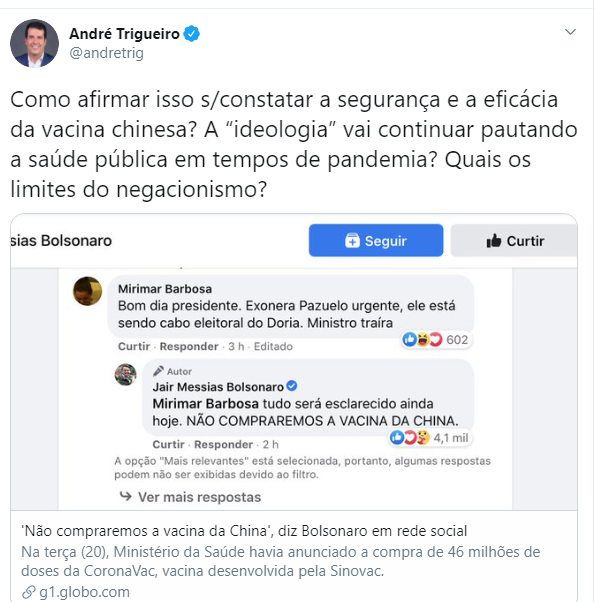 Na segunda-feira, 19, antecipando o desespero do presidente ignorante, o Estadão publicou um texto com o título “A politização da vacina”, mostrando a importância da vacina chinesa e a pequenez do presidente. Leia alguns parágrafos:
