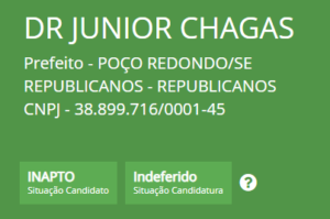 Poço Redondo: Júnior Chagas tem candidatura indeferida E o Tribunal Regional Eleitoral de Sergipe – TRE/SE, indeferiu a candidatura de Júnior Chagas a prefeito de Poço Redondo, pelo Republicanos. Com isso o município tem agora apenas dois candidatos: Binho do Mercadinho, pelo PP e Roberto Araújo, pelo PT.