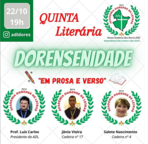 Hoje, 22/10, às 19h, Quinta Literária: Dorensenidade Nesta quinta-feira, dia 22/10, a live da Academia Dorense de Letras será em “prosa e verso”. Mediada pelo Prof. Luís Carlos (Presidente da ADL), tendo como convidados o poeta Jânio Vieira (Cadeira número 17) e a cordelista Salete Nascimento (cadeira número 4), a transmissão começará às 19h, Não percam aqui: https://www.instagram.com/adldores/