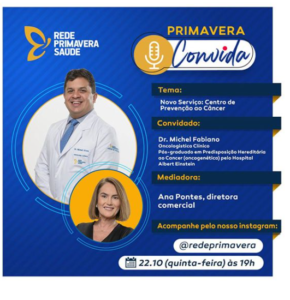 Live hoje, 22/10, às 19h “Novo Serviço: Centro de Prevenção são Câncer” Dentro do projeto Primavera Convida, a live de hoje, 22/10, às 19h, terá a participação do médico Michel Fabiano, oncologista clínico, pós-graduado em Predisposição Hereditária ao Câncer (oncogenética) pelo Hospital Albert Einstein que debaterá o tema: “Novo Serviço: Centro de Prevenção são Câncer” tendo como mediadora a diretora comercial da Rede Primavera, Ana Pontes. Acompanhe aqui: https://www.instagram.com/redeprimavera/
