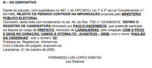 Laranjeiras: Paulão da Varzinhas tem registro candidatura deferido Em Laranjeiras, o prefeito candidato à reeleição, Paulão das Varzinhas, como era esperado teve o registro deferido no Tribunal Regional Eleitoral – TRE/SE, para desespero da oposição que sem ter o que criticar vinha espalhando que ele não seria candidato. Ontem, 21, o juiz eleitoral Fernando Luís Lopes Dantas rejeitou os pedidos de impugnação da candidatura.