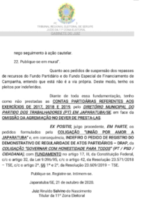 Japaratuba: Justiça eleitoral impugna toda chapa do PT E a Justiça Eleitoral, através do titular da 11ª Zona Eleitoral, juiz Rinaldo Salvino do Nascimento, impugnou toda a chapa comandada pelo PT que desejava disputar a Prefeitura de Japaratuba, tendo Rui Silva Brandão (Rui Brandão) como candidato a prefeito e de Siziana Alcântara Cardoso (vice). Leia toda sentença aqui.DRAP – AUSENCIA PRESTAÇÃO CONTAS – PT – JAPARATUBA – 21 OUT 2020