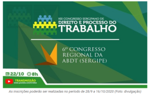 Hoje, 22, XIII Congresso Sergipano de Direito e Processo do Trabalho e 6º Congresso Regional da ABDT O Tribunal Regional do Trabalho da 20ª Região (TRT20), a Associação dos Magistrados da Justiça do Trabalho da 20ª Região (AMATRA XX), a Escola da Magistratura do Trabalho da 20ª Região (EMATRA XX), a Escola Judicial do TRT da 20ª Região (EJUD 20) e a Academia Brasileira de Direito do Trabalho (ABDT) promoverão, no mês de outubro, o XIII Congresso Sergipano de Direito e Processo do Trabalho e o 6º Congresso Regional da Academia Brasileira de Direito do Trabalho. O evento acontecerá hoje, 22, a partir das 8h, de forma telepresencial, por meio da plataforma Google Meet, com transmissão ao vivo pelo canal do TRT20 no YouTube: https://www.youtube.com/watch?v=hklgpF7p530 Participarão dos Congressos ministros, desembargadores, juízes, advogados e operadores jurídicos ligados ao Direito do Trabalho e outros profissionais.
