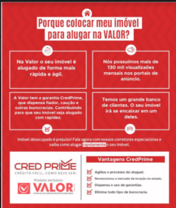Produto exclusivo O CredPrime é um produto exclusivo da Valor Imobiliária e pode ser adquirido por você que quer ser isento de garantia! Se você é funcionário público, Profissional liberal ou empresário e quer alugar o seu imóvel sem burocracia e com agilidade o CredPrime vai facilitar a sua vida. Escolha o seu imóvel no nosso site e ligue pra agendar a sua visita. Entre em contato conosco para obter mais informações. Você vai ver como alugar se tornará um processo fácil e sem burocracia. Venha para a Valor Imobiliária e seja um cliente Prime: www.valorimobiliaria.com.br ou entre em contato pelo número (79) 3226-4222.