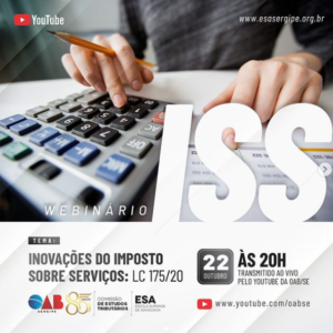 Webinário hoje, 22, às 20h ISS; Inovações do imposto sobre serviços: LC 175/20 A OAB/SE em parceria com a ESA local realiza hoje, 22, a partir das 20h, o – Webinário ISS; Inovações do imposto sobre serviços: LC 175/20 – com transmissão ao vivo no www.youtube.com/oabse com palestra de Gabriel Quintanilha, doutorando em direito, mestre em economia, pós-graduado em direito público e tributário, extensão em tributação internacional, e autor do livro – Mandado de Segurança no Direito Tributário. Debate por conta de Felipe Ribeiro, Secretário da nossa Comissão de Assuntos tributários, MBA em direito tributário, professor e palestrante. Contamos com a sua audiência e participação.