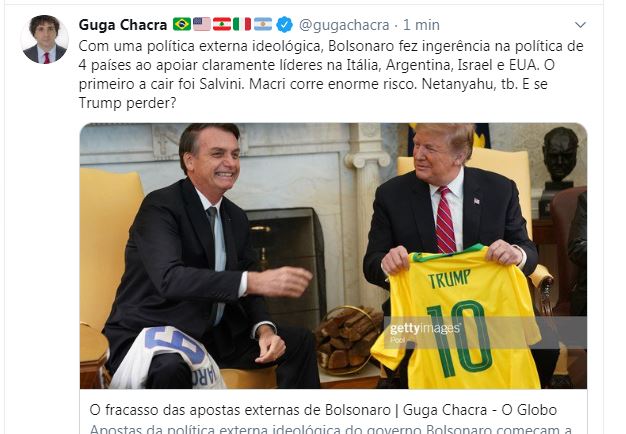 www.twitter.com/gugachacra Com uma política externa ideológica, Bolsonaro fez ingerência na política de 4 países ao apoiar claramente líderes na Itália, Argentina, Israel e EUA. O primeiro a cair foi Salvini. Macri corre enorme risco. Netanyahu, tb. E se Trump perder?