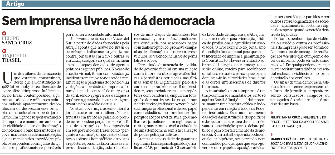 *FELIPE SANTA CRUZ É PRESIDENTE DO CONSELHO FEDERAL DA ORDEM DOS ADVOGADOS DO BRASIL (OAB) MARCELO TRÄSEL É PRESIDENTE DA ASSOCIAÇÃO BRASILEIRA DE JORNALISMO INVESTIGATIVO (ABRAJI)