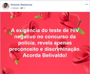 www.twitter.com/AntonioSamarone A exigência do teste de HIV negativo no concurso da polícia, revela apenas preconceito e discriminação. Acorda Belivaldo!
