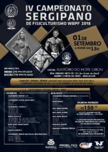 4º Campeonato Sergipano de Fisiculturismo Será realizado em Aracaju no próximo dia 1º de setembro, o 4º Campeonato Sergipano de Fisiculturismo WBPF, no Orion hotel a partir das 15h. Os melhores atletas de Sergipe irão se confrontar com seus esculpidos a ferro, dieta e muito sacrifício a seletiva para o Campeonato Nacional que será em São Paulo no dia 15 de setembro. Todos os admiradores e amantes do Fisiculturismo competitivo estão convidados. E que vença o melhor.