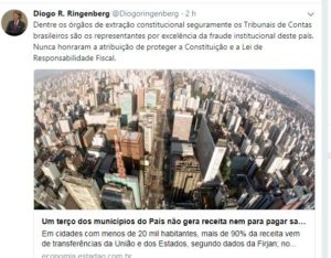 www.twitter.com/Diogoringenberg Dentre os órgãos de extração constitucional seguramente os Tribunais de Contas brasileiros são os representantes por excelência da fraude institucional deste país. Nunca honraram a atribuição de proteger a Constituição e a Lei de Responsabilidade Fiscal.