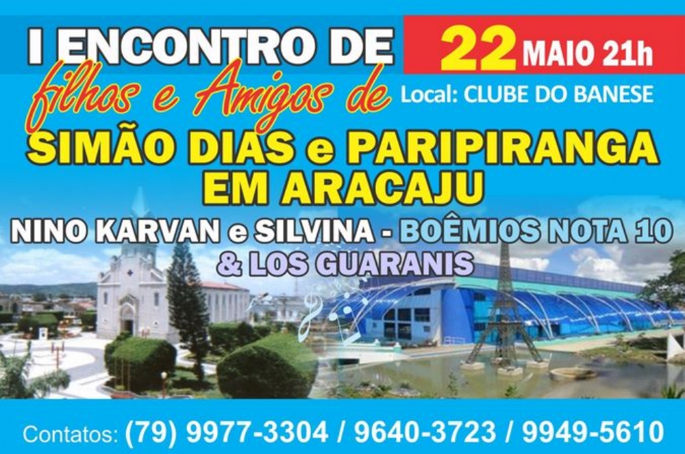 Paripiranga em Aracaju" que será no Clube do Banese na sexta-feira (22) a partir das 21h. As atrações ficarão a cargo dos "Boêmios Nota 10 (Nino Karvan e Silvina Aquino) e Los Guaranis.O Evento será aberto ao público, filhos e amigos.Se você não adquiriu sua mesa, que o faça na ocasião do evento, na portaria do Clube.Contato: (79) 9977-3304.