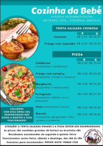 de Bebé, em Aracaju O oratório está passando por dificuldades e as freiras e noviças estão cozinhando e vendendo para custear a alimentação delas mesmas e das 85 crianças. Quem gosta de pizza e pede toda semana, pode encomendar de segunda a quinta-feira, para receber na sexta, no sábado ou domingo. As pizzas são excelentes e estão recebendo elogios dos clientes porque duas das noviças que estão fazendo as pizzas são italianas. Quando pedirem pizza, pensem em provar a do Oratório de Bebé!