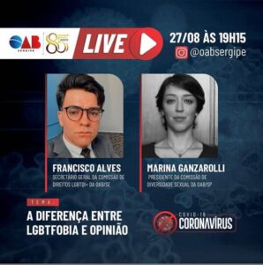 Live hoje, 27/08, às 19h15 “A diferença entre LGBTfobia e opinião” A OAB Sergipe através da Comissão de Direitos LGBQI+ traz o tema: A diferença entre a Lgbtfobia e a opinião para debate entre Francisco Alves, Secretário geral da Comissão em nossa seccional, e Marina Ganzarolli, Presidente da Comissão de Diversidade Sexual da OAB São Paulo. Esse debate será feito em mais uma #oabselive, desta vez no dia 27, quinta-feira, às 19h15. Participe: https://www.instagram.com/oabsergipe/