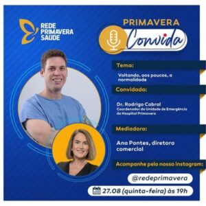 Live hoje, 27/08, às 19h “Voltando, aos poucos, a normalidade” Hoje, 27, às 19h, dentro do projeto “Primavera Convida” da Rede Primavera Saúde, o convidado é coordenador da Unidade de Emergência do Hospital Primavera, Dr. Rodrigo Cabral. Na live, mediada pela diretora comercial, Ana Ponte, o convidado explicar sobre o processo de retomada das atividades do hospital. Participe: https://www.instagram.com/redeprimavera/