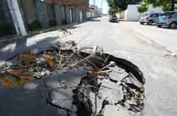 O buraco da foto ao lado (foto César de Oliveira)cai bem com o início da música “Sonhos” do cantor Peninha: “Tudo era apenas uma brincadeira e foi crescendo, crescendo,…” Vai completar aniversário de um mês e como o leitor pode ver está tomando quase toda passagem de um trecho da rua Guarapari, na Atalaia. O buraco fica em frente ao CAP Primavera, da Prefeitura de Aracaju e na rua que é passagem para entrada dos fundos do Palácio de Veraneio. Os moradores estão fazendo uma cota para comprar o bolo de aniversário…