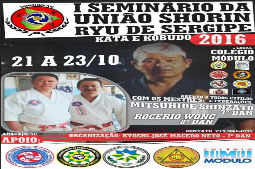 O I Seminário de Karate Shorin Ryu acontecerá de 21 a 23 de outubro no colégio Módulo (Em Aracaju – Contatos 79 – 99866 – 8775) com a presença dos Kyoshi Mitsuhide Shinzato e Rogério Wong que virão fortalecer e adicionar conhecimentos teóricos e práticos a todos do karate nordestino. Estes dois Mestres estão divulgando a escola Shinshukan, criada em homenagem ao mestre Shinzato que deixou um legado dentro do karate.