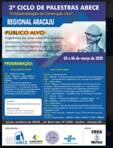 3º Ciclo de Palestras ABECE Com o tema “A Industrialização da Construção Civil” será realizado em Aracaju, nos dias 05 e 06 de março, no auditório da AEASE, o 3º Ciclo de Palestras da Associação Brasileira de Engenharia e Consultoria Estrutural – ABECE. O evento é uma realização da associação nacional com o apoio da regional Aracaju. Todos os detalhes das palestras e das mesas redondas, além das inscrições aqui: http://site.abece.com.br/index.php/fichas-de-inscricoes